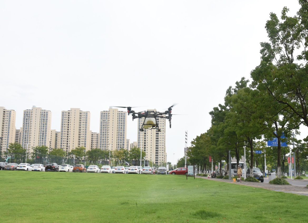此次為園區(qū)首次采用無人機(jī)噴灑農(nóng)藥,在防治前,建發(fā)公司綠化管理人員和路段養(yǎng)護(hù)技術(shù)人員多次實(shí)地勘探區(qū)域內(nèi)試驗(yàn)點(diǎn),結(jié)合人流量等多種因素,最終噴灑農(nóng)藥區(qū)域選擇在中央商務(wù)區(qū)。在專業(yè)技術(shù)人員的操控下,植保無人機(jī)按預(yù)設(shè)路線不斷前進(jìn),細(xì)密的噴液滴通過霧化器處理后均勻地噴灑在草坪上。不到4小時(shí),一次全面精準(zhǔn)的病害防治工作已經(jīng)高效完成。