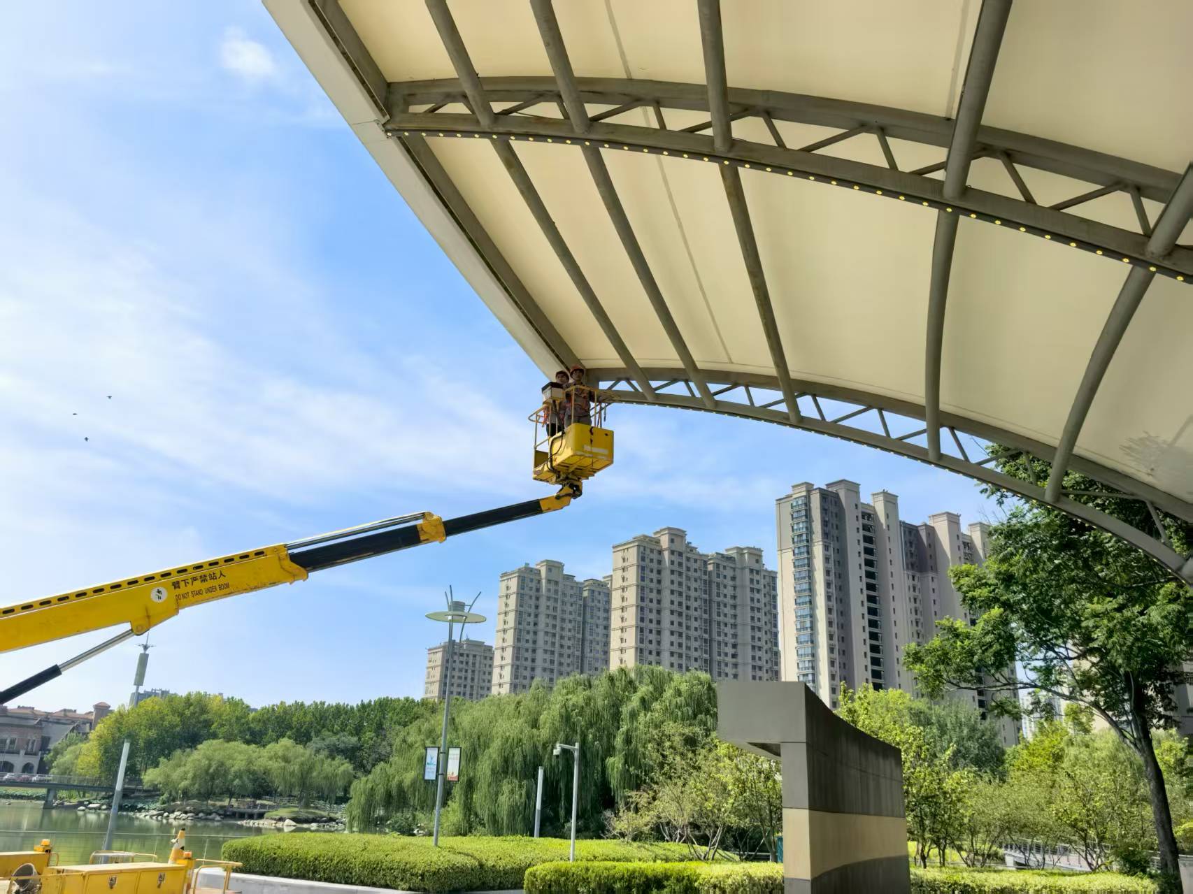 “今天在蘇州公園大舞臺進(jìn)行登高作業(yè),維修頂部燈光。注意作業(yè)平臺與頂棚保持安全距離……”8月20日上午9點,夏日驕陽似火,蘇州公園作業(yè)現(xiàn)場氣溫已接近37℃。園區(qū)機(jī)電維護(hù)項目部技術(shù)負(fù)責(zé)人沈剛強(qiáng)和同事們開始了當(dāng)天的第一場高空維修。