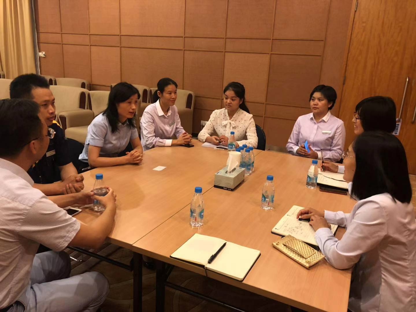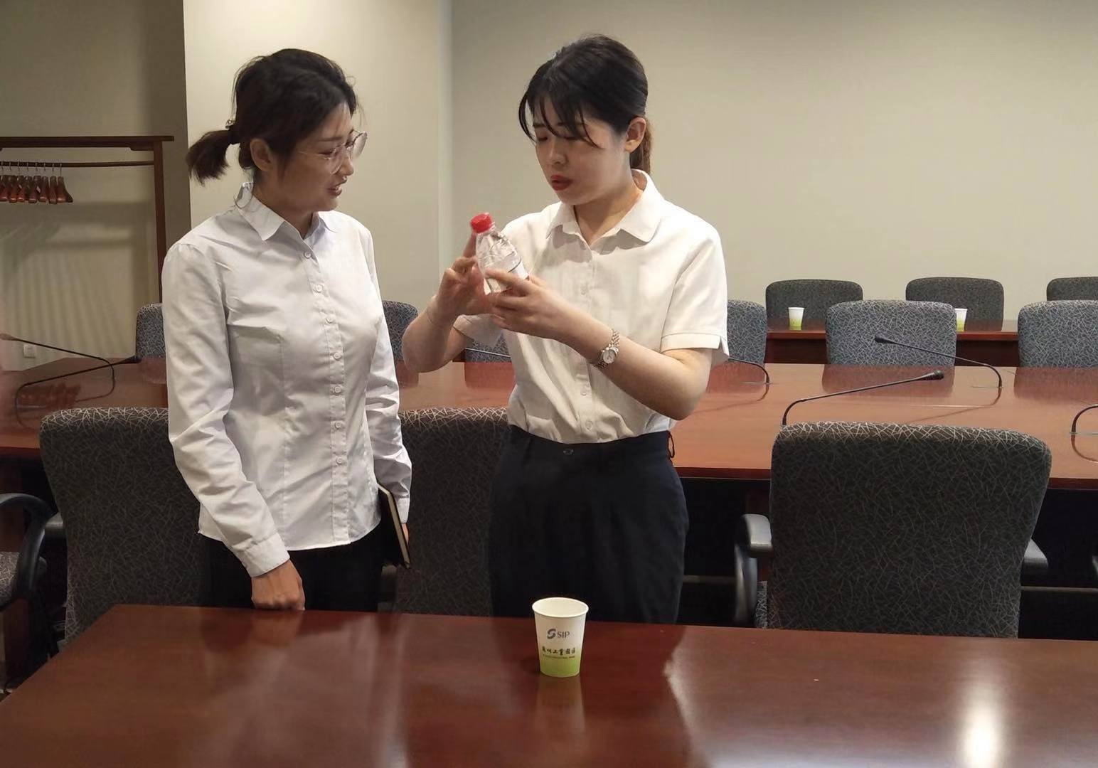 一行人兵分兩路,客服環(huán)境組跟隨蘇州工業(yè)園區(qū)環(huán)境部負責(zé)人學(xué)習(xí)會務(wù)服務(wù)的會前準備工作、會后清潔工作,重點學(xué)習(xí)會務(wù)實操服務(wù),工程人員跟隨工程部學(xué)習(xí)會議廳設(shè)備配置和保養(yǎng)。